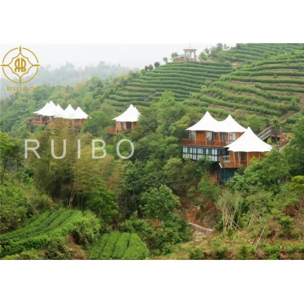 The hotel tent uses a modular steel-wood frame, which can be used safely and stably in different terrains. The tent can adapt to the temperature range of -30° to 70°, and can withstand the wind speed of 80-120km/h in the outdoor environment, bringing rain and snow. The eco-roof is made of ultra-light PVC, PVDF, PTFE and other materials, with good waterproof, UV resistance, tear resistance, and B1/M2 fire resistance. Most hotel tent manufacturing processes are completed at the factory, which can reduce construction time.